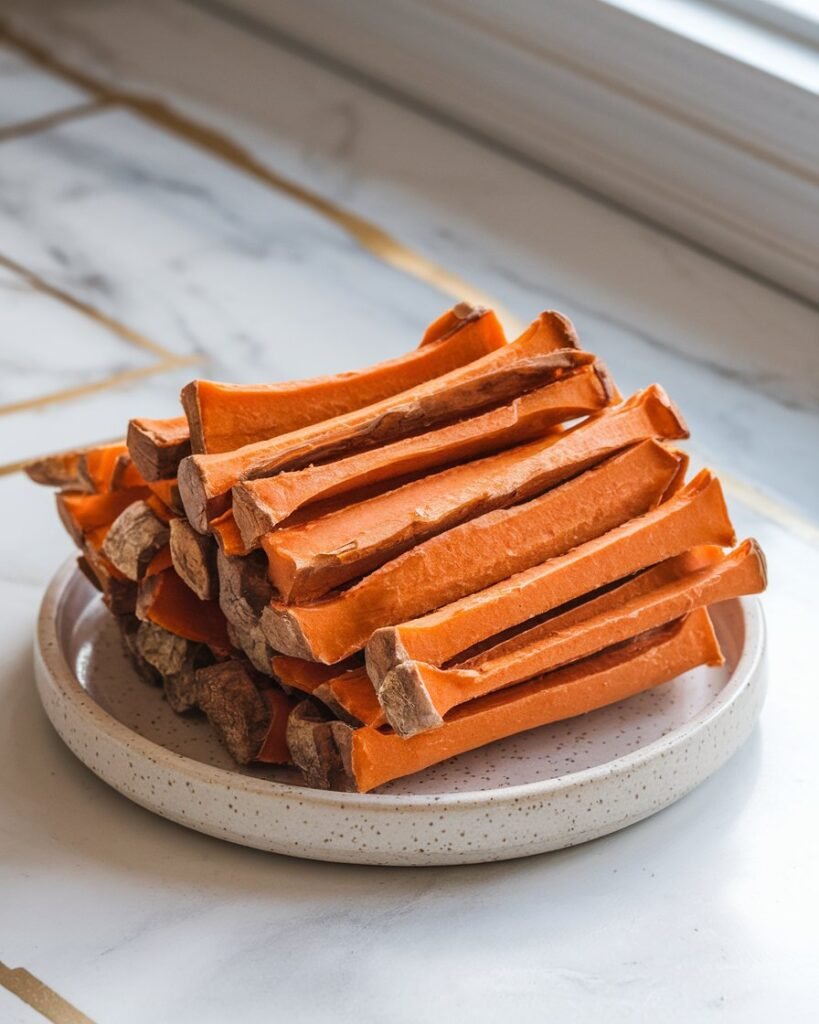 These chews are naturally sweet, satisfyingly chewy, and packed with fiber and vitamins. They’re gentle on the stomach and teeth, making them ideal for both puppies and seniors. With no added salt, sugar, or preservatives, you’re offering your dog a healthy, homemade alternative to processed treats. Plus, the long strips or slices give them a satisfying chew that helps reduce boredom and support dental health.